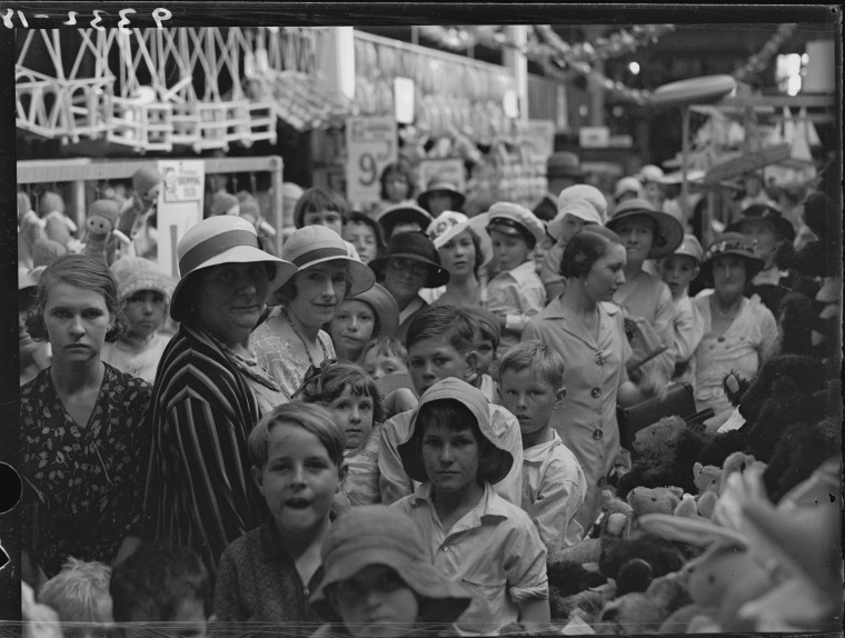 015403PD: Crowds welcome Father Christmas at the Perth Railway Station as he makes his way to Boans Toy Town, 21 November 1934