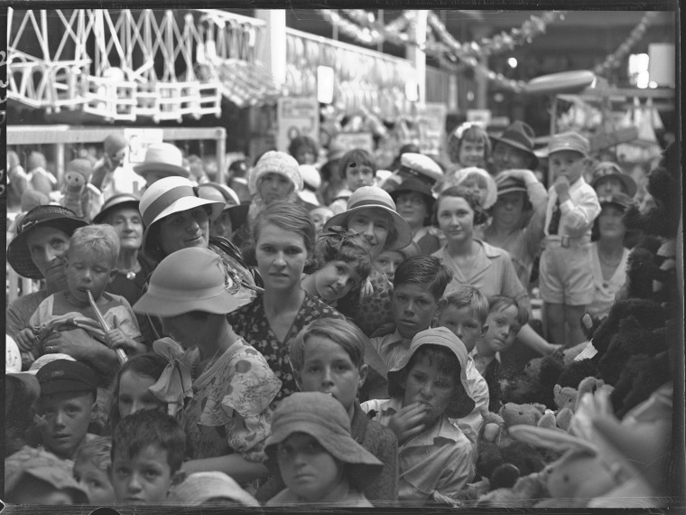 015405PD: Crowds welcome Father Christmas at the Perth Railway Station as he makes his way to Boans Toy Town, 21 November 1934