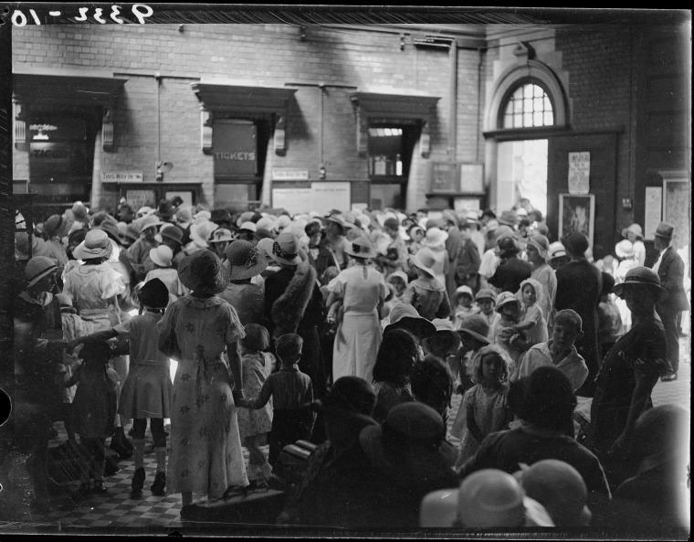 015396PD: Crowds welcome Father Christmas at the Perth Railway Station as he makes his way to Boans Toy Town, 21 November 1934