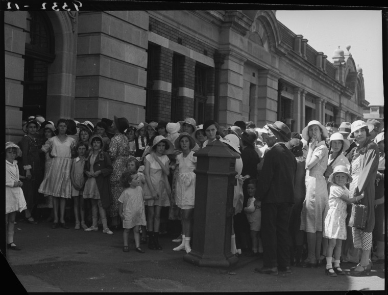 015398PD: Crowds welcome Father Christmas at the Perth Railway Station as he makes his way to Boans Toy Town, 21 November 1934