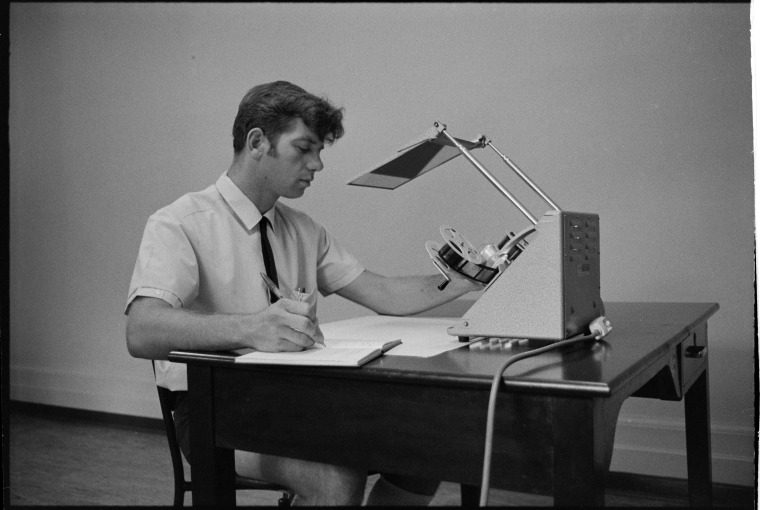319502PD: Checking microfilm for quality and completeness. J.S. Battye Library of West Australian History and State Archives, 1969