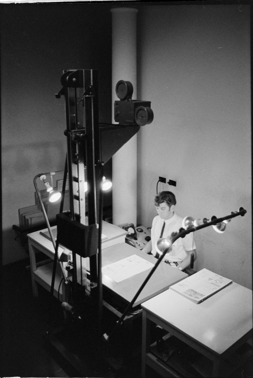 319513PD: Microfilm camera in operation. J.S. Battye Library of West Australian History and State Archives, 1969