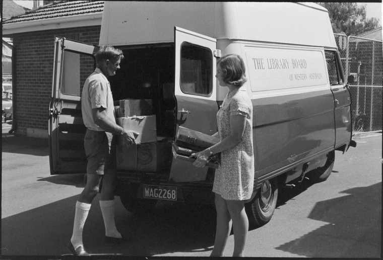 319499PD: Loading the State Library Board van moving some records to one of the annexes. J.S. Battye Library of West Australian History and State Archives, 1969