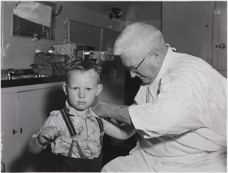 BA2070/28: Dr J.J. Holland vaccinates a child for polio in the No.1 Mobile Clinic Salk Vaccine Anti Poliomyelitis Campaign, July 1956