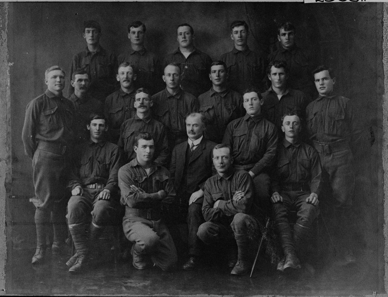 025001PD: Collie Boys in the 11th Battalion, 3rd Infantry Brigade, 1914. Left-right Back row: J. Connolly, G.W. Gane, W.E. Webb, W. Kenning, C. Watson; Centre: C. Thompson, N.R. Nicholl, F.H. Hodgson, W.W. Paterson, J. Miller, George Lamerton, J.S. Horroc