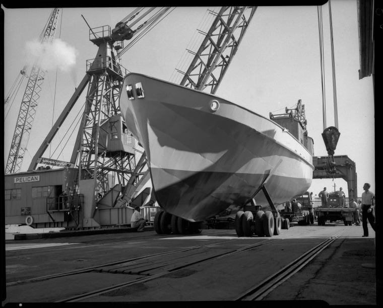 113902PD: Lady of Fatima (LFBF 297) fishing boat hull is put into the water, Fremantle, 31 December 1958