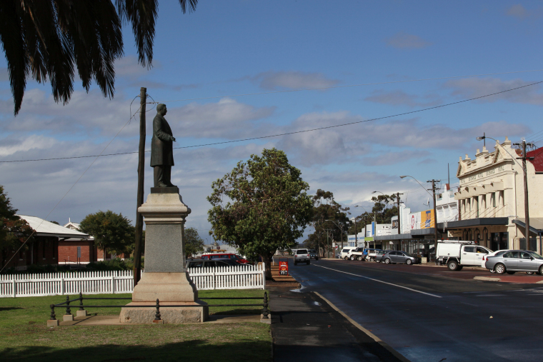 Statue of F.H. Piesse on Austral Terrace, Katanning, the Royal Exchange Hotel at right, 8 May 2013