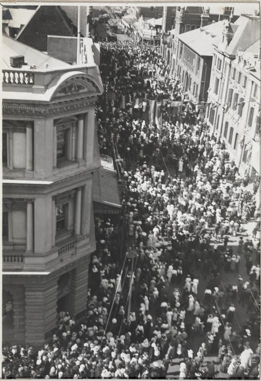 BA292/12/8: A.I.F. reinforcements march through Perth, crowd dispersing after march past Barrack Street (looking north), Perth, 1917