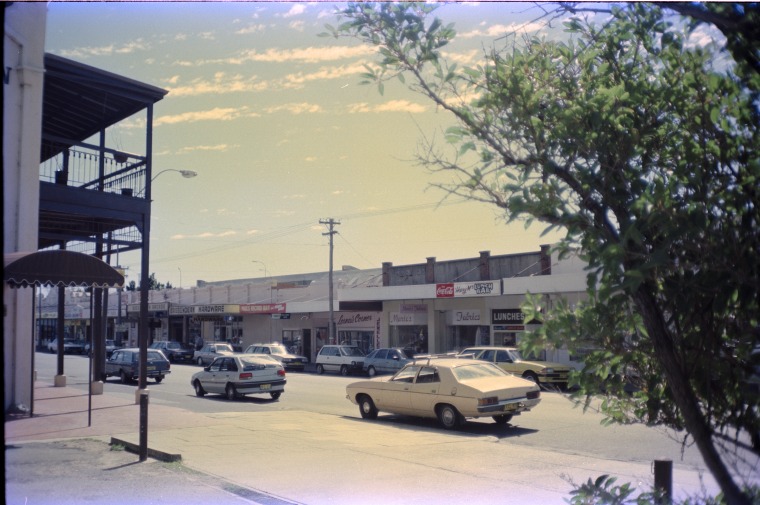 314832PD: Bassendean Arcade, Bassendean Hardware, Paul's Record Bar and Video Hire, Lorna's Corner Jewellers, Marie's Fabrics, Harry M's Lunch Bar, Old Perth Road, Bassendean, August 1987