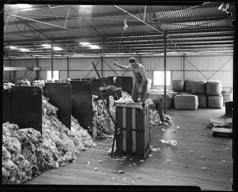 114695PD: Pressing wool in the shearing shed at Bindoon Boys' Town, 31 March 1966