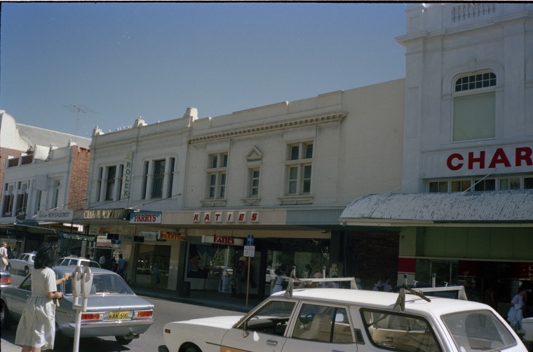 313300PD: Putting a coin into the parking meter in Adelaide St, Fremantle. L-R: Parkside Newsagency, Chas. H. May Jewellers, and entrance to Parry's Department Store, Katies, April 1984