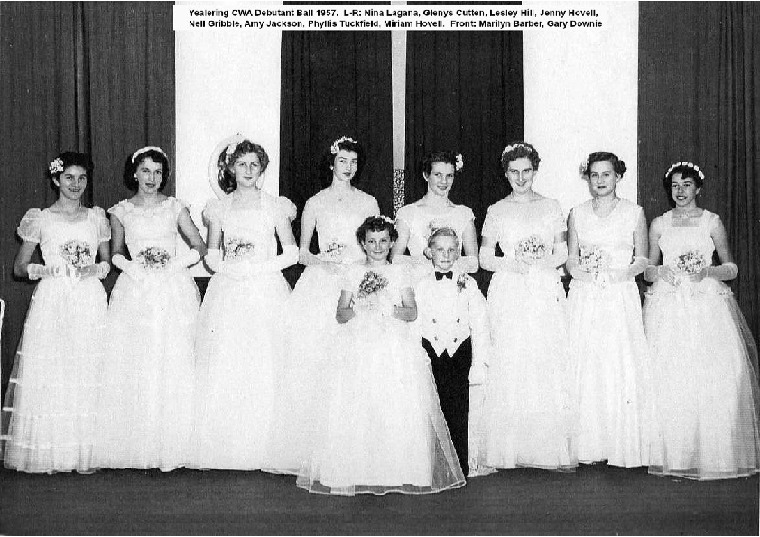 YRC7: CWA Debutant Ball. L-R: Nina Lagana, Glenys Cutten, Lesley Hill, Jenny Hovell, Nell Gribble, Amy Jackson, Phyllis Tuckfield, Miriam Hovell. Front: Marilyn Barber, Gary Downie