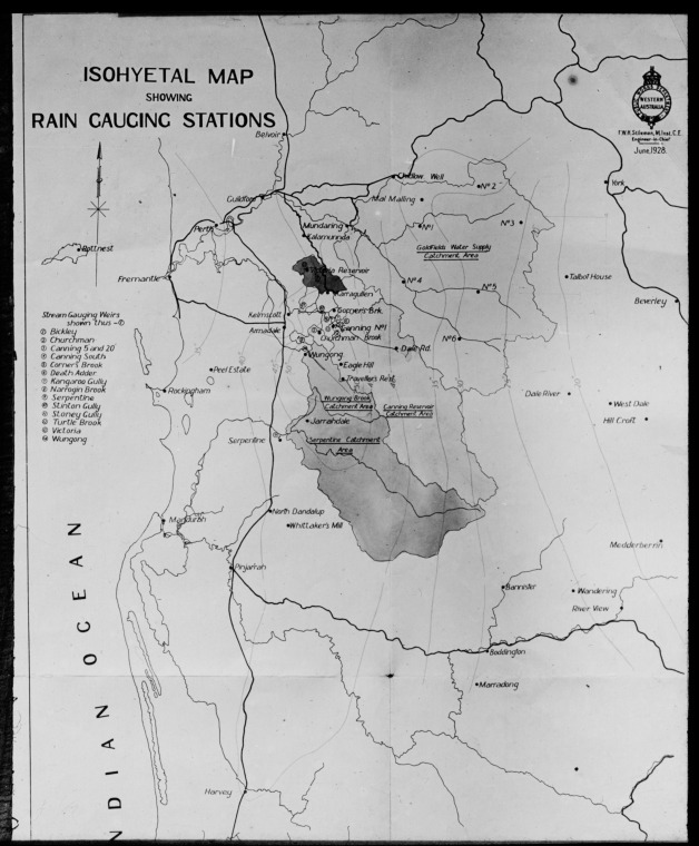 207158PD: Map relating to the Goldfields Water Supply scheme. Isohyetal map showing rain gauging stations, between 1903 and 1927.