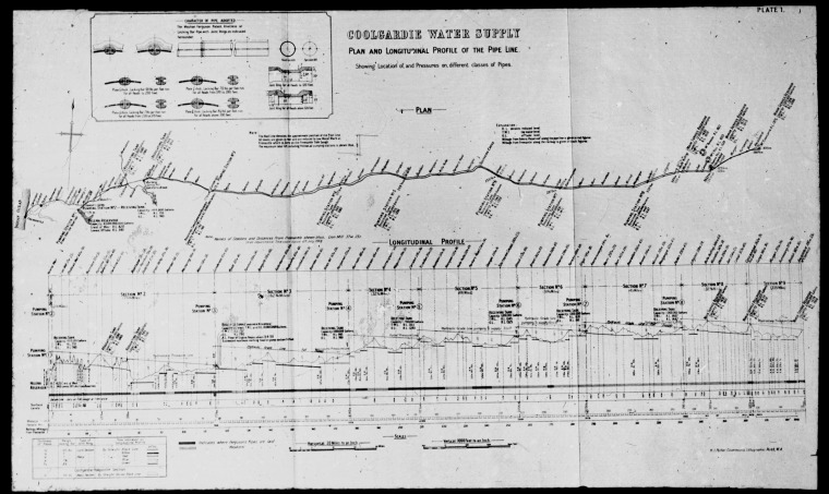 207133PD: Diagram relating to the Goldfields Water Supply scheme. Coolgardie Water Supply : plan and longitudinal profile of the pipeline, between 1903 and 1927.