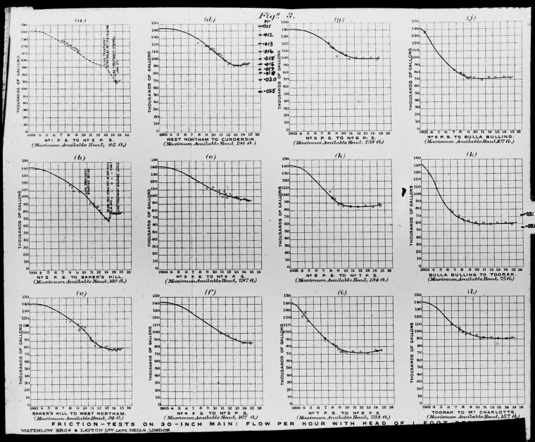 207150PD: Graph relating to the Goldfields Water Supply scheme. Friction - tests on 30 inch main : flow per hour with head of 1 foot, between 1903 and 1927.