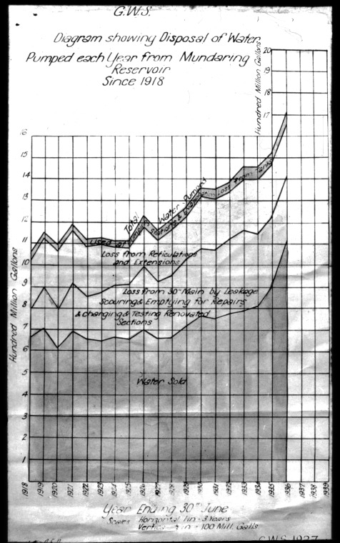 207155PD: Graph relating to the Goldfields Water Supply scheme. G.W.S. diagram showing disposal of water pumped each year from Mundaring Reservoir since 1918, 1927.