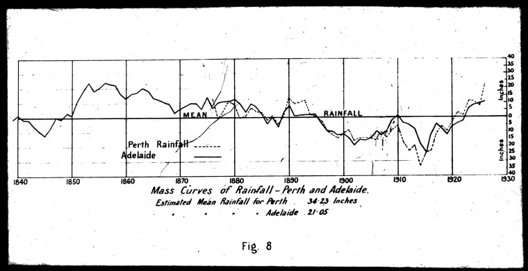 207157PD: Graph relating to the Goldfields Water Supply scheme. Mass curves of rainfall - Perth and Adelaide, 1927.