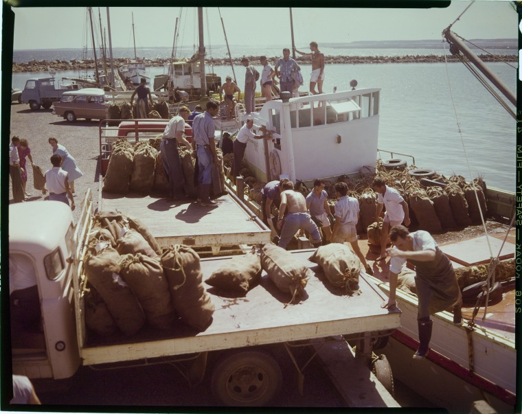 228008PD: Unloading western rock lobsters from the Lady Joyous at Geraldton Harbour, ca. 1962.