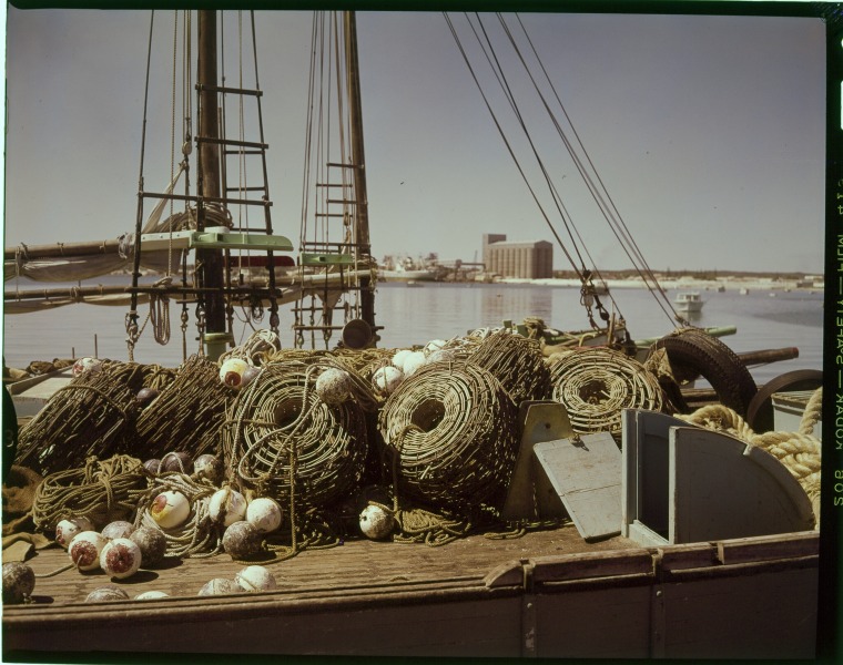 228012PD: Crayfish pots and floats stacked on boat at Geraldton Harbour, ca. 1962.