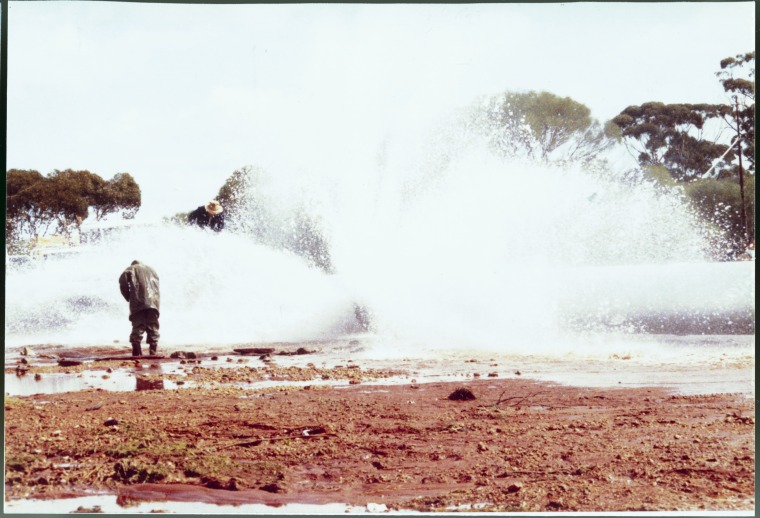195278PD: Burst section on the Goldfields Water Supply pipeline, 11 Mile Hill burst with pad and plate (purpose made in Cunderdin workshops) positioned over hole and held by clamps, August 1991.