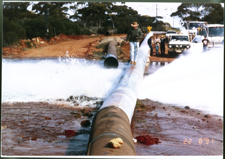 195279PD: Burst section on the Goldfields Water Supply pipeline, probably due to faulty welding, 11 Mile Hill, west of Coolgardie, Ray Turnbridge (welder) on pipe with Greg, Rod, and Roger, August 1991