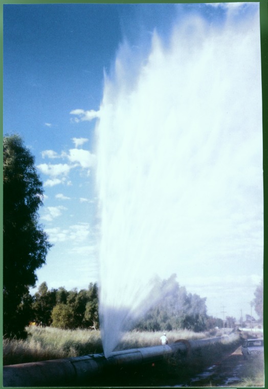 195282PD: Repairs on the Goldfields Water Supply pipeline, burst at patch on locking bar, near Coolgardie, between 1989 and 1992.