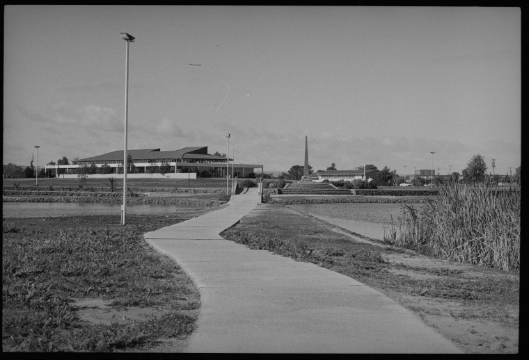244125PD: View along footpath and over bridge to Ruth Faulkner Library and the City of Belmont War Memorial, 1972?