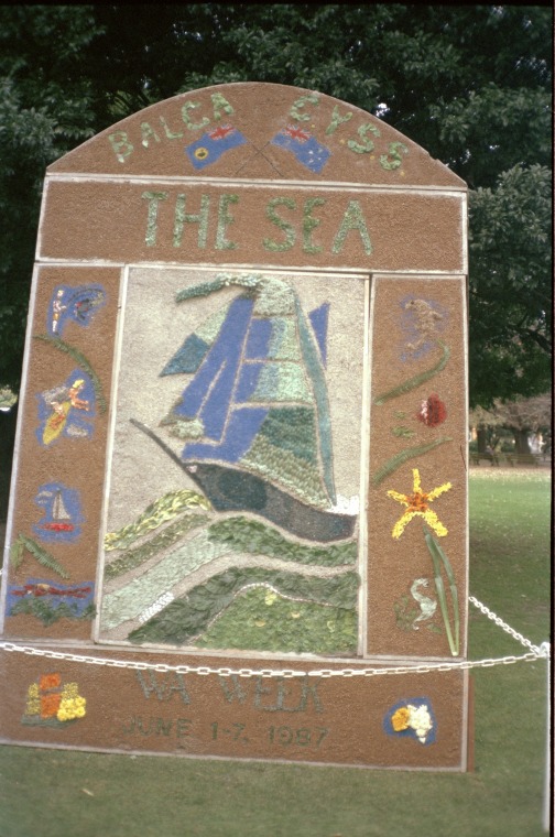 314917PD: Model made from dried flowers and clay by Balga CYSS to represent landing of the first fleet in W.A., Supreme Court Gardens, June 1987