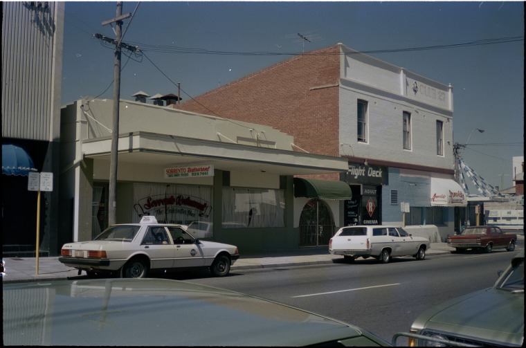 312937PD: Sorrento Restaurant (no. 158), The Flight Deck Adult Cinema, Arnold's All Night Cafe and the Champagne Room (formerly Club 27) corner of James and Lake Streets, Northbridge, January 1984