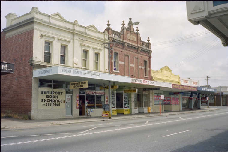 311806PD: Beaufort Book Exchange, Curran's Meat Supply and other small businesses in a strip of shops, 485-499 Beaufort Street (corner of Mary Street), Highgate, November 1982