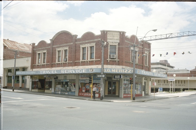 311290PD: Noarlunga Chambers, premises of G.G. Merizzi Travel Service and Venezia Tailors, 208 William Street (corner of James Street), Perth, January 1982