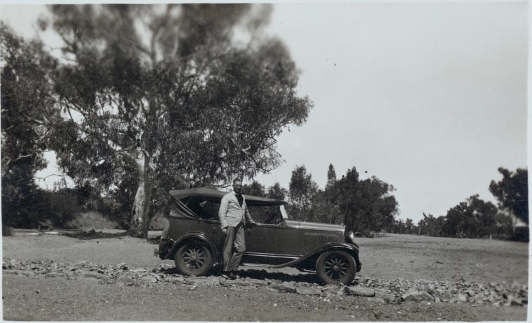 303119PD: Possibly Rev. F.C. Dixon with the St. Andrew's Anglican Parish car on a Mullewa road, ca. 1933.