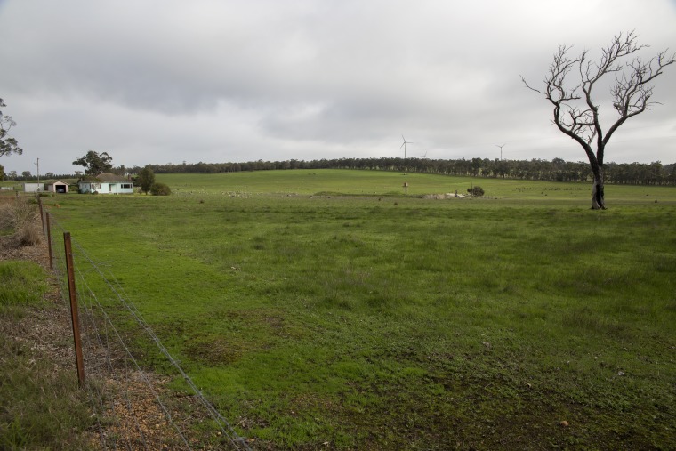 BA2493/405: A farm on the northern edge of Mount Barker west side of Albany Highway, wind turbines in the distrance, 24 June 2014