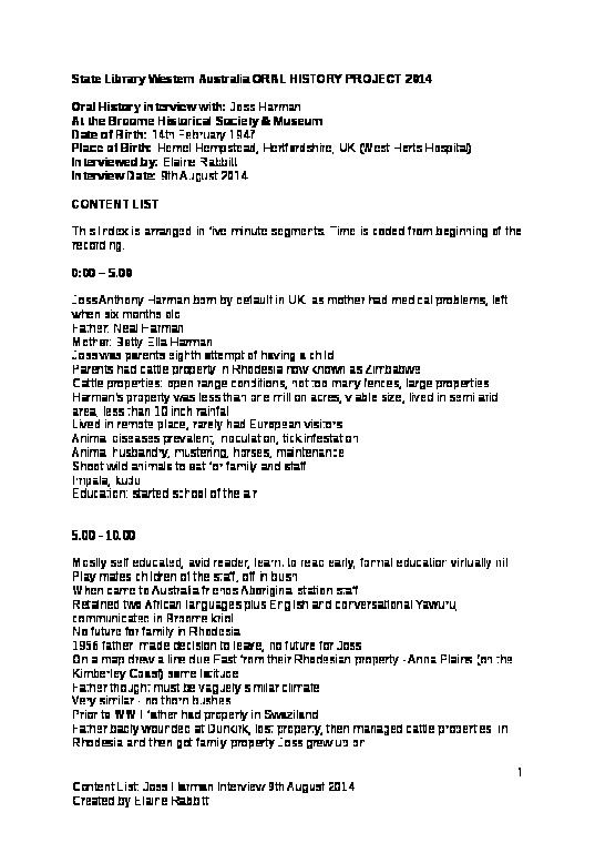 Timed index of interview with Joss Harman in 2014 / by Elaine Rabbitt.