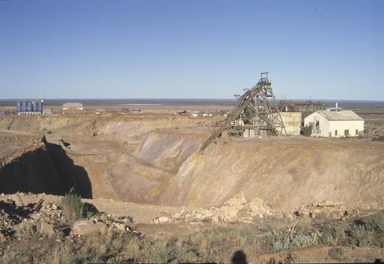 142658PD: Pit, minehead, winder house, and storage bin at the Sons of Gwalia mine, 1985.