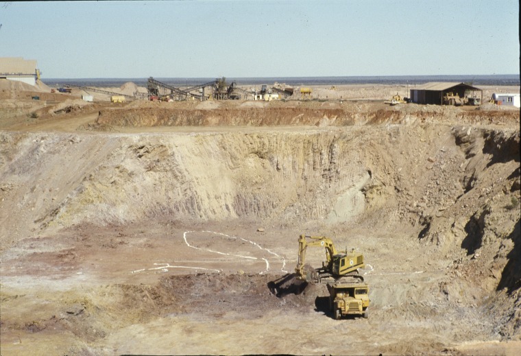 142661PD: Pit at the Sons of Gwalia mine, with modern plant in background, 1985.