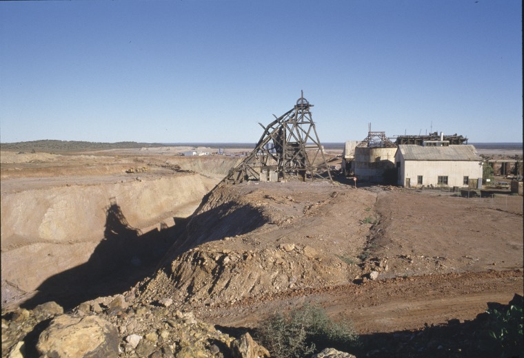 142683PD: Sons of Gwalia mine from the north, including cut, headframe and mine buildings, 1985.