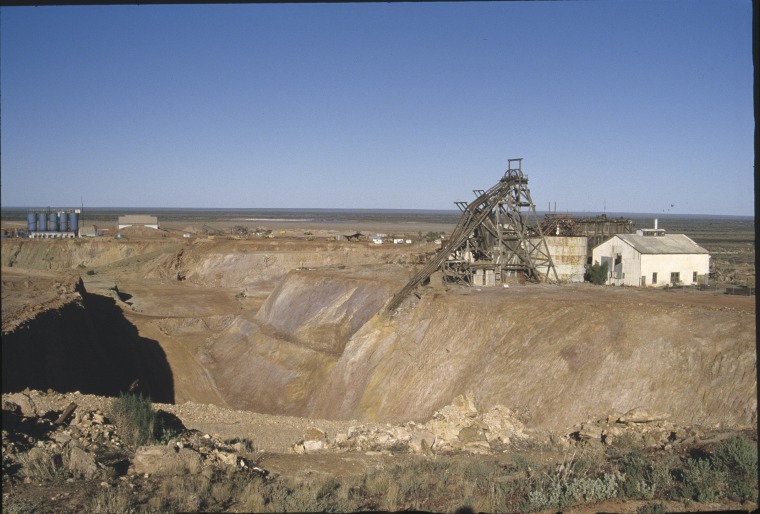 142638PD: Pit, headframe and winder house at the Sons of Gwalia mine, 1985.