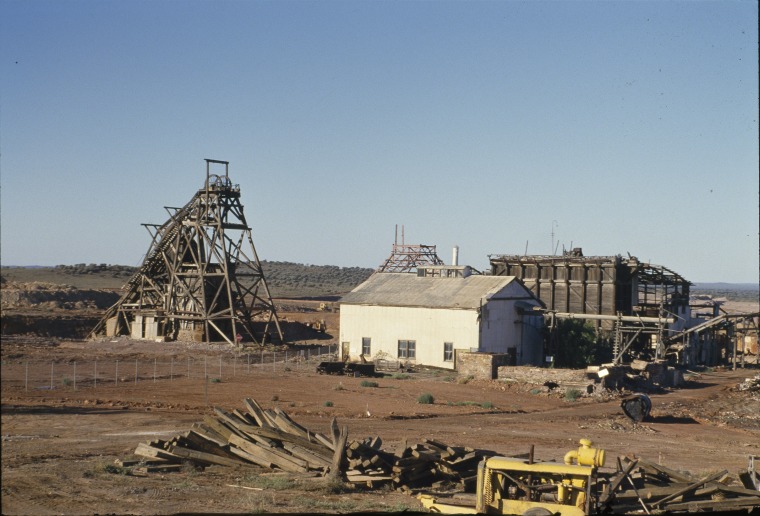 142650PD: Headframe, winderhouse and wooden ore storage bin at the Sons of Gwalia mine, 1985.