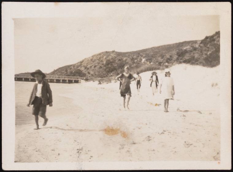 BA2655/12: People on the beach with floodgates at Torbay Inlet in the background