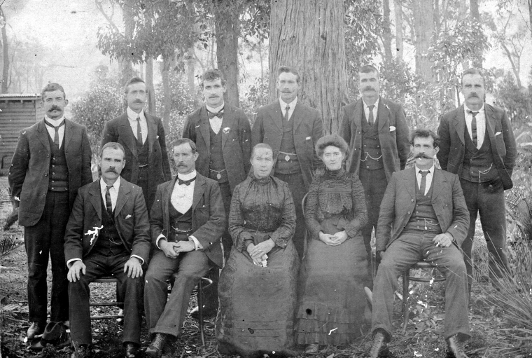 BA2642/33: Mc Leod family. Back row L to R: Tom, Harry, George, Bob, Jack, Alick. Front row: Jim, Dan, Mother, Emma, Pimo, 1905