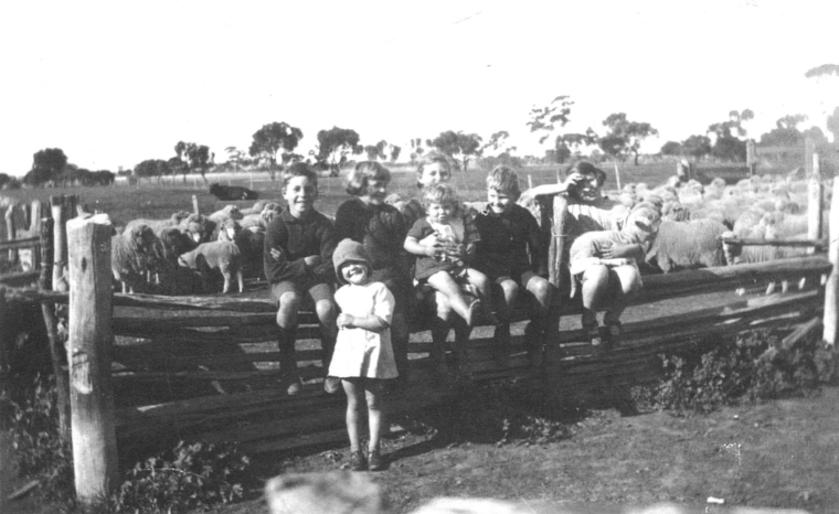 BA2642/106:Roy Dall, Clare Dall, Beryl Dall nursing Frank, Jean Price nursing lamb, Mabel standing, 1928