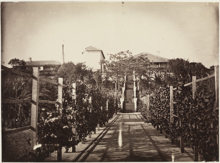 6923B/159: Lower garden at Strawberry Hill, residence of A.P. Burt, Adelaide Terrace, Perth, 1862. View from the edge of the river to the back of the house.