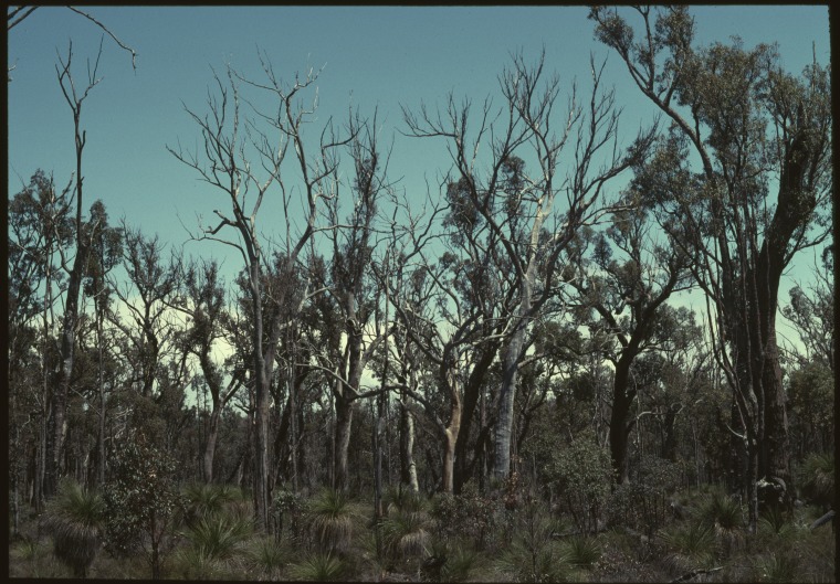 147990PD: Jarrah forest with dieback (Phytophthora cinnamomi), Brookton Highway, Western Australia, ca. 1965-1984.