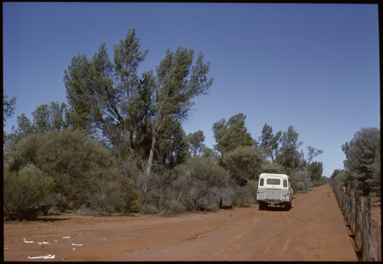 148176PD: Cypress pine and Acacia growing along the Rabbit Proof Fence, north of Bonnie Rock, Western Australia, ca. 1965-1984.