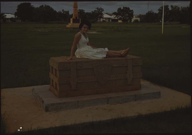 146255PD: Betty Foster posing on the Dampier Memorial, Broome, May 1961