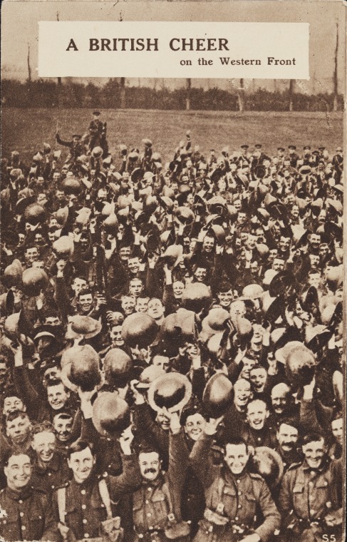 ACC 3471A/147: Postcard of soldiers cheering on the Western Front