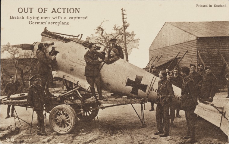 ACC 3471A/144: Postcard of British flying-men with captured German aeroplane