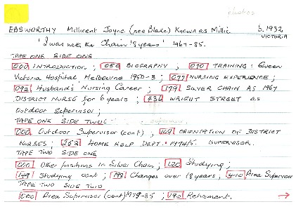 OH4154/34 Index Card Side 1: Interview with Millicent (Millie) Ebsworthy on 21 Jun 1989