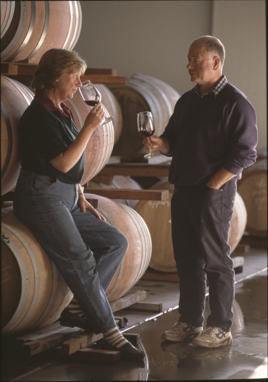 146744PD: Shelley Coad samples wine with John Wade, winemaker in the cellar of Jingalla Wines, Porongurup, 1994?